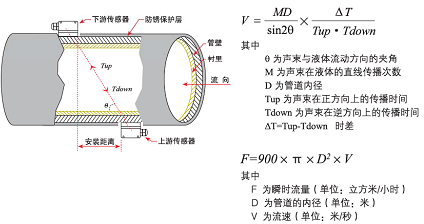 當(dāng)超聲波束在液體中傳播時,液體的流動將使傳播時間產(chǎn)生微小變化,其傳播時間的變化正比于液體的流速,零流量時,兩個傳感器發(fā)射和接收聲波所需的時間完全相同(唯一可實(shí)際測量零流量的技術(shù)),液體流動時,逆流方向的聲波傳輸時間大于順流方向的聲波傳輸時間。其關(guān)系符合下面表達(dá)式:
