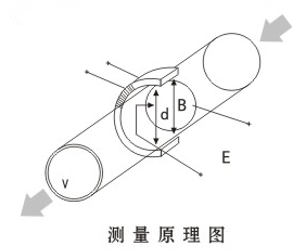 測(cè)量流量時(shí),導(dǎo)電性液體以流速V流過(guò)垂直干流動(dòng)方向的磁場(chǎng),導(dǎo)電性液體的流動(dòng)感應(yīng)出一個(gè)與平均流速成正比的電壓,其感應(yīng)電壓信號(hào)通過(guò)與液體直接接觸的電極檢出。對(duì)于同一流量計(jì)S. B. d為常量,所以流量與感應(yīng)電動(dòng)勢(shì)E(或流速V)的大小成正比。